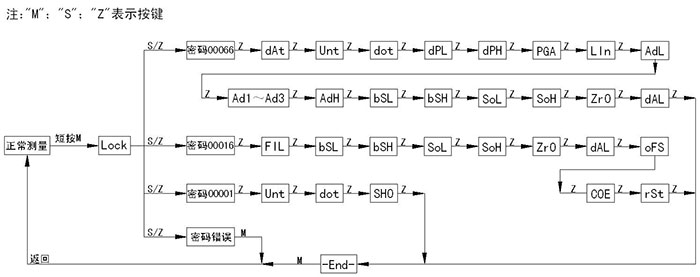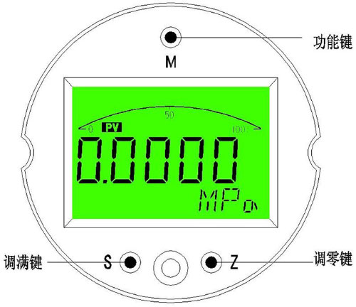 4.2.2調(diào)滿鍵“S” ?測量模式下短按為顯示模式修改功能。 ?測量模式下長按5秒為進(jìn)入調(diào)滿功能(即標(biāo)定變送器滿點(diǎn))。 ?設(shè)置模式下為設(shè)置參數(shù)加一功能,長按時(shí)連續(xù)移位加一。 4.2.3調(diào)零鍵“Z” ?測量模式下短按為顯示模式修改功能。 ?測量模式下長按5秒為進(jìn)入調(diào)零功能(即標(biāo)定變送器零點(diǎn))。 ?設(shè)置模式下為設(shè)置參數(shù)移位與減一功能,長按時(shí)連續(xù)移位或減一。 4.2.4按鍵功能綜述 儀表通過面板的三個(gè)按鍵實(shí)現(xiàn)所有的參數(shù)輸入和校準(zhǔn)數(shù)據(jù)的設(shè)置、采集,本儀表的設(shè)置和輸入采取了多種優(yōu)化措施來提高客戶的操作速度: ?儀表的移位鍵和增加鍵具有變速率功能。 ?儀表同時(shí)具有移位和增量輸入方法,針對(duì)需要大量數(shù)修改的菜單使用移位方式,需要連續(xù)輸入數(shù)據(jù)的菜單采取了增量方式。 ?儀表在設(shè)置狀態(tài)下會(huì)停止模擬輸出,所以如果60秒內(nèi)用戶沒有操作儀表,則會(huì)自動(dòng)退出到測量狀態(tài)。 ?儀表在正常退出菜單的時(shí)候才會(huì)保存所有設(shè)置的參數(shù)。 4.3快捷功能 ?儀表有主變量清零,零點(diǎn)有源遷移,滿點(diǎn)有源遷移三種快捷功能,便于用戶現(xiàn)場的快速設(shè)定。 4.3.1主變量清零 主變量清零即PV清零,是相對(duì)大氣壓下的零點(diǎn),不是傳感器量程的零點(diǎn)。將變送器直接置于大氣壓下,長按“M”鍵5秒以上,即可進(jìn)入主變量清零功能,如右圖,菜單區(qū)顯示“P=0”,通過“S”鍵和“Z”鍵選擇需要進(jìn)行的操作,提示符區(qū)相應(yīng)顯示: